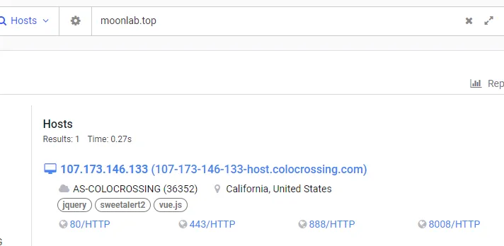 由于80端口并没有指定default_server,所以在处理没有提供server name的请求时,nginx会fallback到第一个virtual server,好巧不巧就是我的评论系统的代理服务,关于我博客的评论系统可以看博客评论系统的选择 | MoonLab 而由于我的评论系统是需要CORS的,所以response中带有 Access-Control-Allow-Origin 的Header,其中暴露了我的域名。这就导致了源站IP的泄露,Censys直接记录到了我的IP。