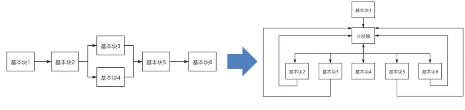 控制流平坦化(Control flow flattening)的基本思想主要是通过一个主分发器来控制程序基本块的执行流程: